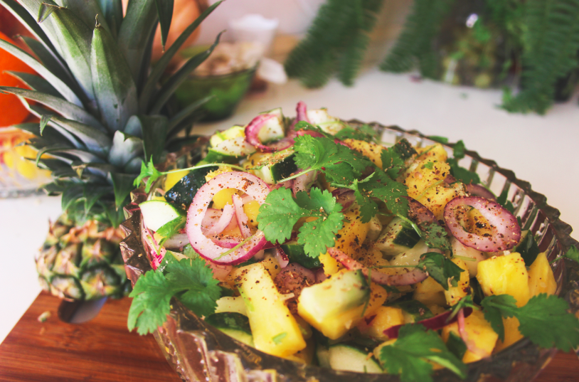 Step 1: Cut the pineapple and the cucumber into cubes.